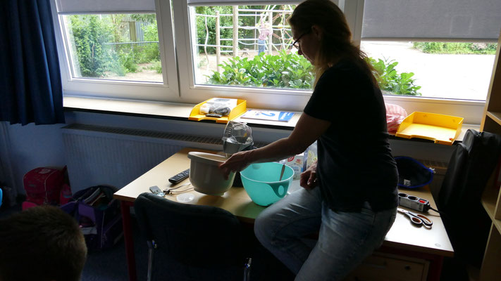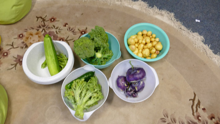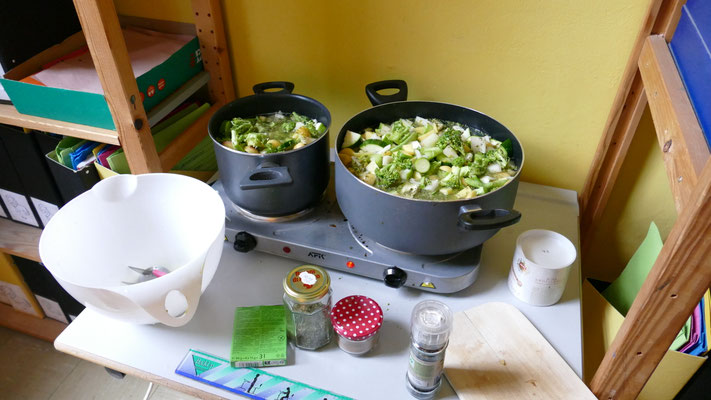 Klasse 1 hat heute aus ihrem Hochbeet geerntet und daraus eine Gemüsesuppe gekocht, nachdem sie gesät, gehegt und gegossen haben.