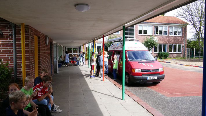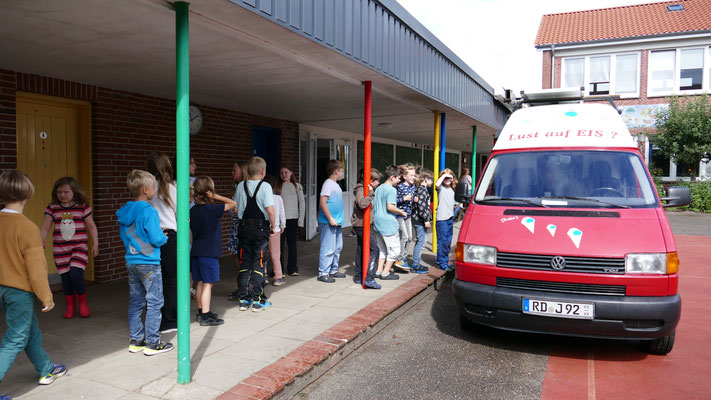 Mittwoch hat uns Jutta mit ihrem Eiswagen besucht. Durch die Haussammlung zum Vogelschießen war es möglich, dass sich zum Ende des Schuljahres jedes Kind 2 Kugeln Eis aussuchen durfte. Jutta hat die Streusel dazu spendiert. Die Aktion kam großartig an!